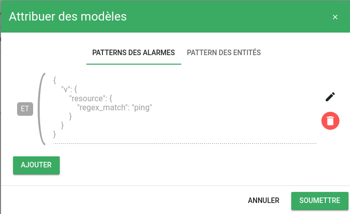 Lorsque votre consigne a été créée, vous devez l'assigner à une ou des alarmes. Pour cela, vous allez pouvoir sélectionner ces alarmes grâce à des patterns spécifiques de l'alarme ou de l'entité associée à l'alarme. Utilisez pour cela le bouton d'action situé à droite de votre consigne.